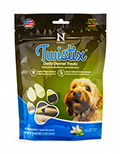 Twistix dental treats have a unique vanilla and mint flavor and help to freshen breath with ingredients like peppermint, parsley, and alfalfa. Their texture helps to clean teeth while satisfying your dog’s urge to chew.