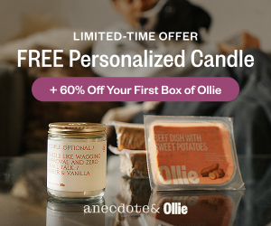 Free personalized candle and 60% off with Ollie